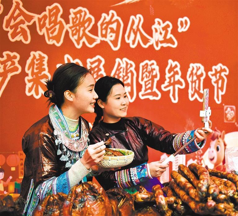 2月8日,贵州省黔东南苗族侗族自治州从江县北上农贸市场,主播在直播销售腊肠。 石宏辉摄(中经视觉)